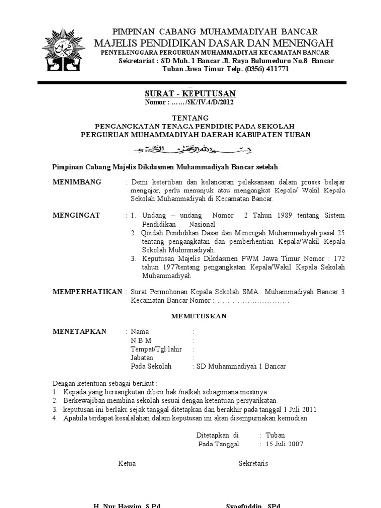 Peraturan Tentang Pergantian Kepala Sekolah Muhammadiyah Dan Mekanisme Penggajian Guru Pwmu Co Portal Berkemajuan from pwmu.co Demikianlah pembahasan yang dapat kami sampaikan mengenai contoh surat pemberitahuan pergantian kepala sekolah ke dinas. Untuk yang membutuhkan sk pengangkatan kepala sekolah yayasan. Contoh surat keputusan penjaga sekolah ini akan sangat membantu guru dan kepala sekolah dalam mencari referensi dokumen dan surat pengadaan tenaga kerja. Pergantian posisi ketua, bendahara dan pengurus ini diharapkan menjadi estafet perjuangan demi kemajuan pada yayasan dan pondok pesantren tersebut. Untuk lebih memperjelas bagaimana contoh/ formatnya, bapak/ibu dapat melihat gambar berikut. Contoh surat pengangkatan pengurus dan tenaga pengajar. Gambar contoh format surat keputusan pengangkatan kepala sekolah terbaik 2019. Sk yayasan pengangkatan kepala ma.